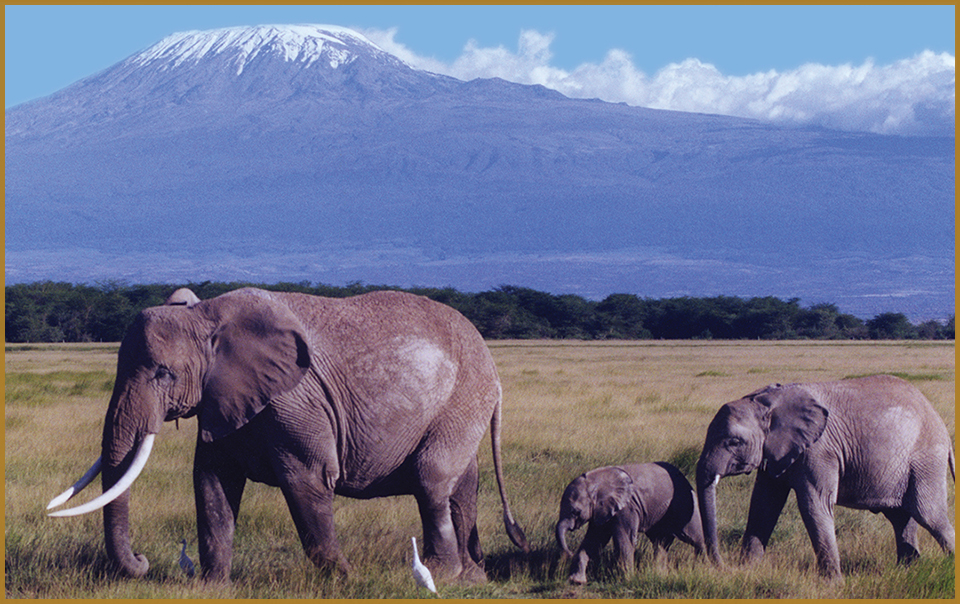 Elephant with her two calves, one just a new baby, with Mount Kilimanjaro in the background.